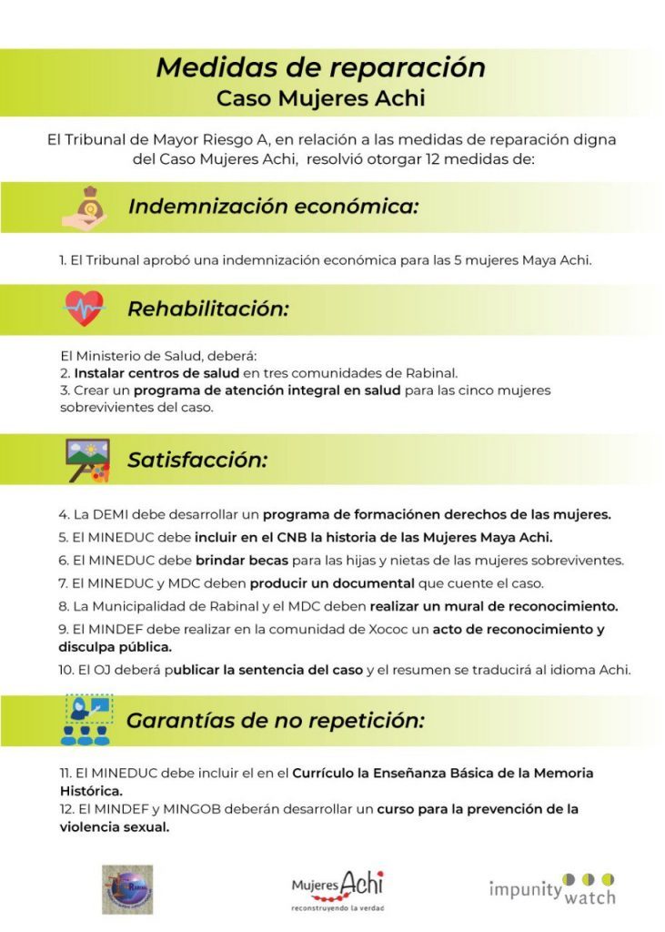 La sentencia fue entregada y las medidas de reparación fueron dadas por el Tribunal el 27 de febrero, en donde se logró pedir que el Estado de Guatemala reconociera su implicación en las violaciones cometidas por los patrulleros y el ejército de Guatemala. En total, 12 medidas de reparación fueron dictadas para la reparación digna de las mujeres.