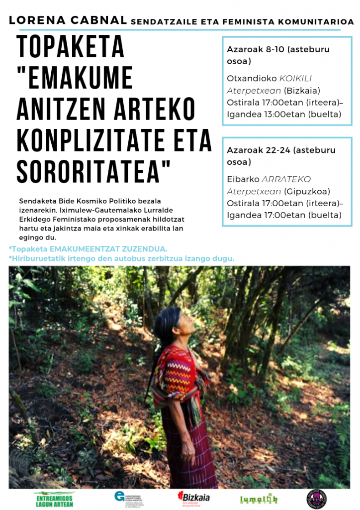 Entreamigos-Lagun Artean elkarteak emakumeen arte asteburu pasa proposatzen dizue. Topaketak horiek, Lorena Cabnal sendatzaile eta feminista guatemaldarrak gidatuko ditu. Sendaketa Bide Kosmiko Politiko bezala izenarekin, Iximulew-Gautemalako Lurralde Erkidego Feministako proposamenak hildotzat hartu eta jakintza maia eta xinkak erabilita lan egingo du.