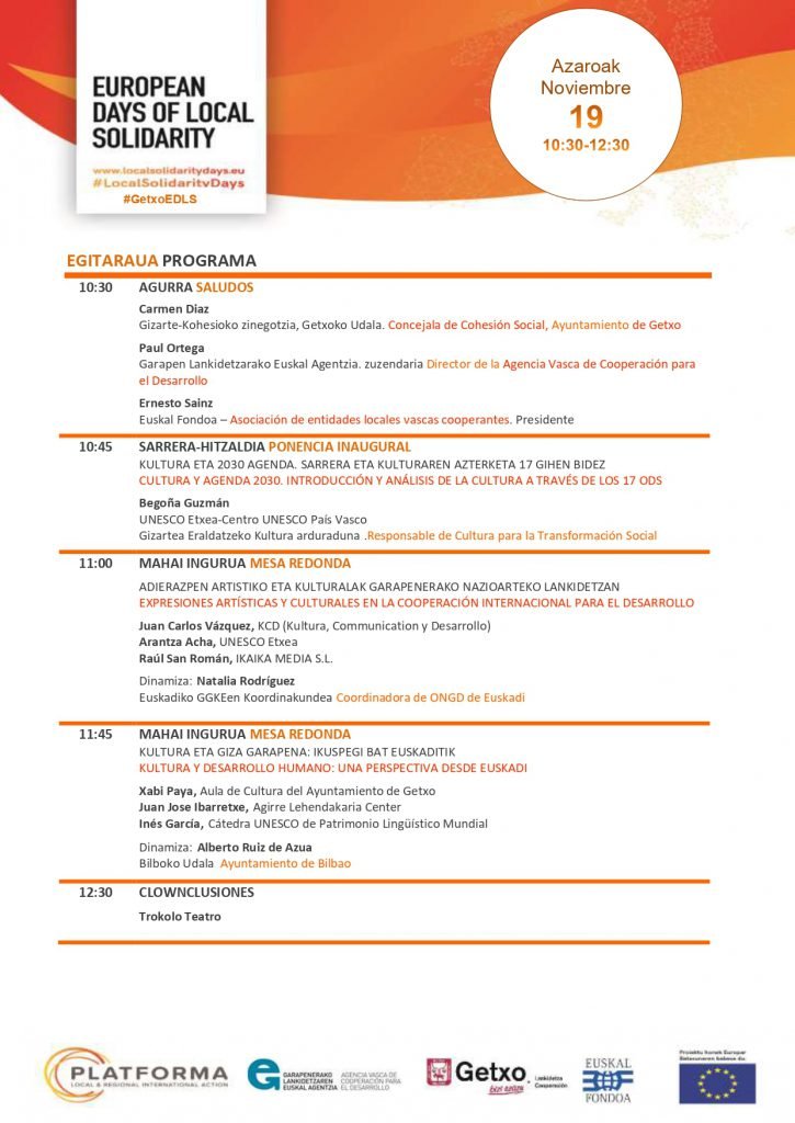 Garapenerako lankidetzaren Euskal Agentziak, Euskal Fondoak eta Getxoko Udalak biharko, 2020ko azaroaren 19a, jardunaldi hau antolatu dute, Kultura (ondarea, arte-adierazpenak, hezkuntza) funtsezko elementutzat hartuta Nazio Batuek bultzatutako 2030 Agendan aurrera egiteko.