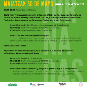 11:15- 12:00 Mahai-ingurua: Zer aurrerapen eta zer erronka ditugu gaur egun Guatemalan zein Euskal Herrian hezkuntzan LGTBIQ+ ikuspegia zeharkatzeko?
