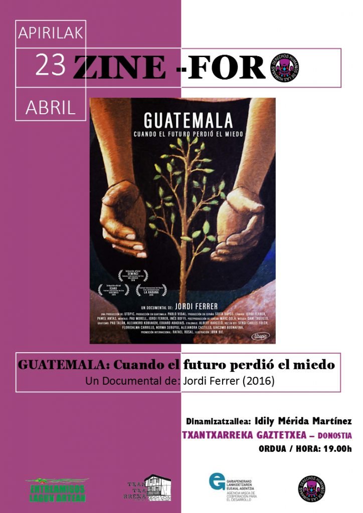 Hurrengo asteartean, hilak 23, Guatemalaren historia ezagutzeko aukera ezin hobea izango dugu. Jordi Ferrek zuzendutako ” Guatemala: cuando el futuro perdió el miedo” dokumentala proiektatuko dugu Txantxarreka Gaztetxean. Zuzendariak Guatemalara egindako bidai baten ondorioz sortutako lana da. Bertako emakumeek bizi zuten biolentzia eta indarkeria ikusita harrituta geratu zen eta horretan oinarritu zuen bere ikerketa lana. Bertako historia aztertu ondoren konturatzen da, gizartea oligarkia patriarkal, arrazista eta misogino baten menpe bizi dela.